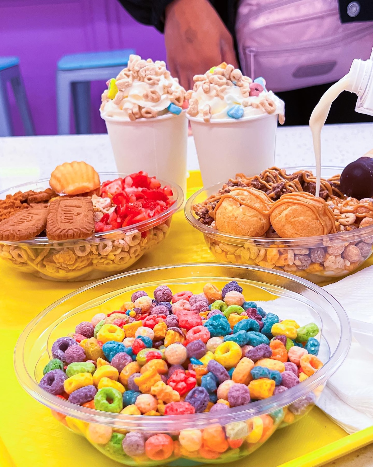 Beyond the basics, the menu leans fully into the theme with cereal toast, cereal sushi rolls, cereal tacos, overnight oats, keto-friendly cereal options, drinks, and fresh fruit toppings sourced from the local farmers market.