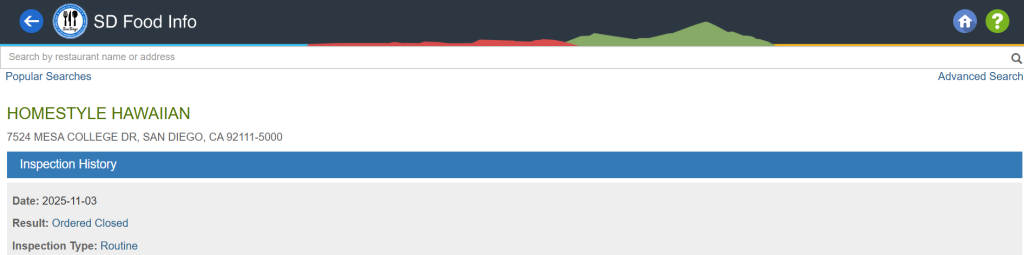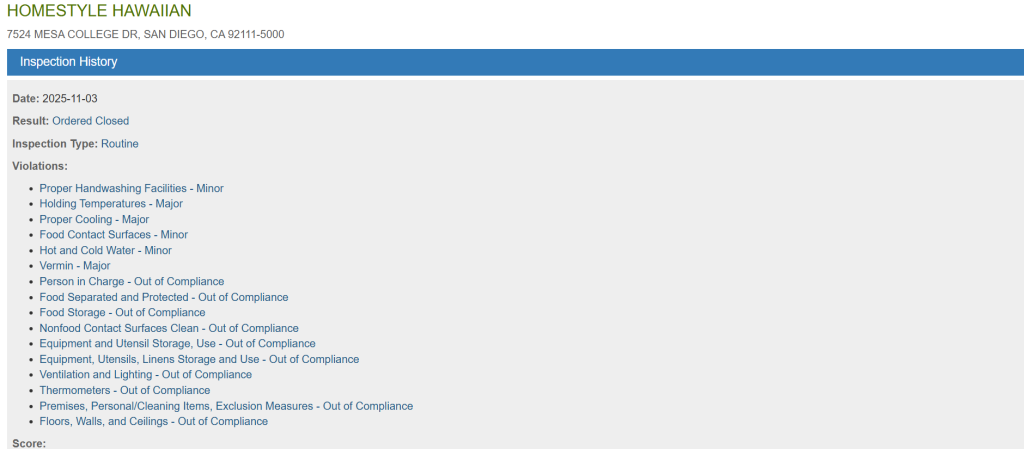 The Department of Environmental Health and Quality of San Diego conducted a routine health inspection at Homestyle Hawaiian restaurant. The inspection report listed several violations. The restaurant was ordered to close temporarily and correct the violations.