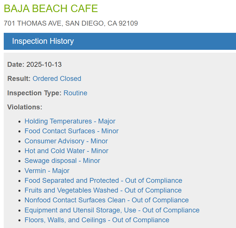 The Department of Environmental Health and Quality of the County of San Diego conducted a routine health inspection at Baja Beach Cafe. According to the inspection report, multiple minor and major violations were cited at the restaurant.