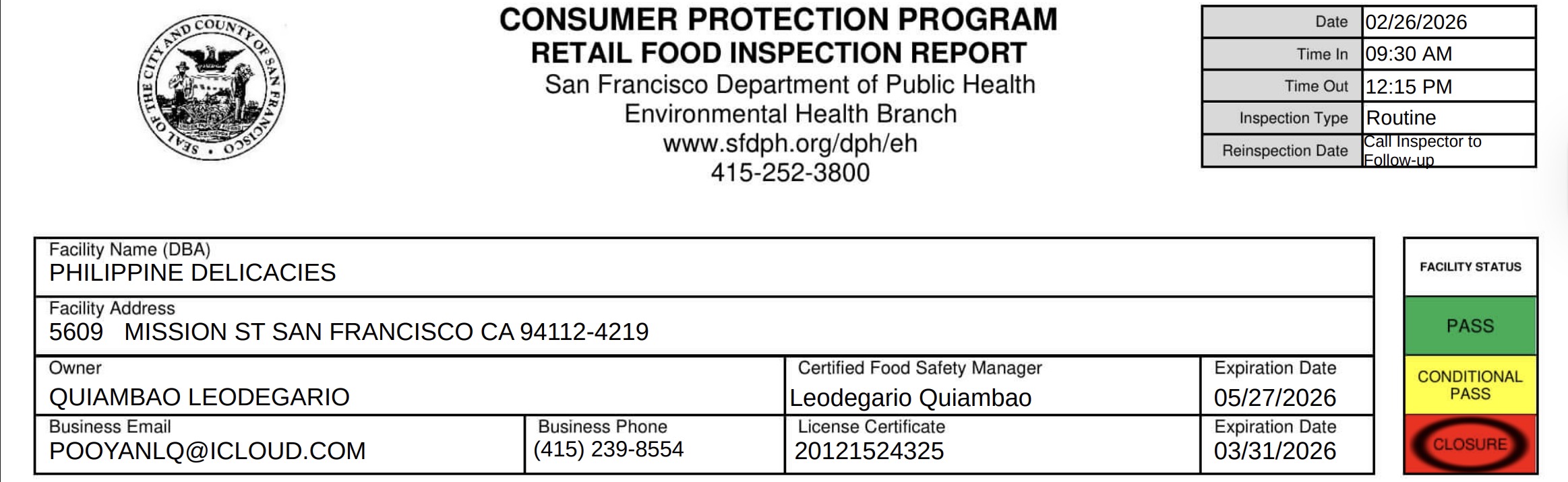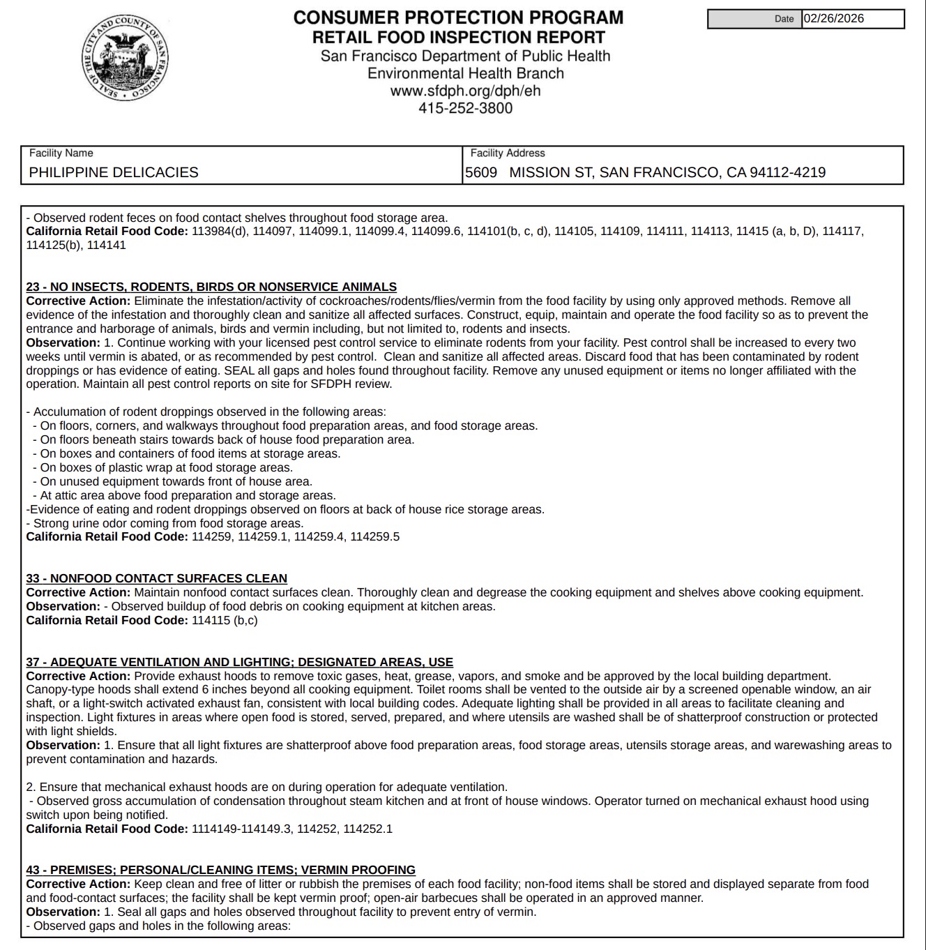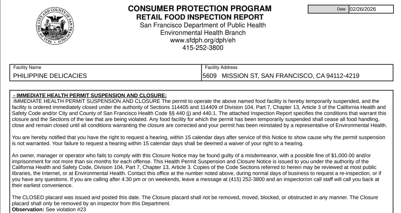 The San Francisco Department of Public Health conducted an inspection at Philippine Delicacies on February 26 and cited the restaurant for violations that resulted in a temporary closure and suspension of its health permit.