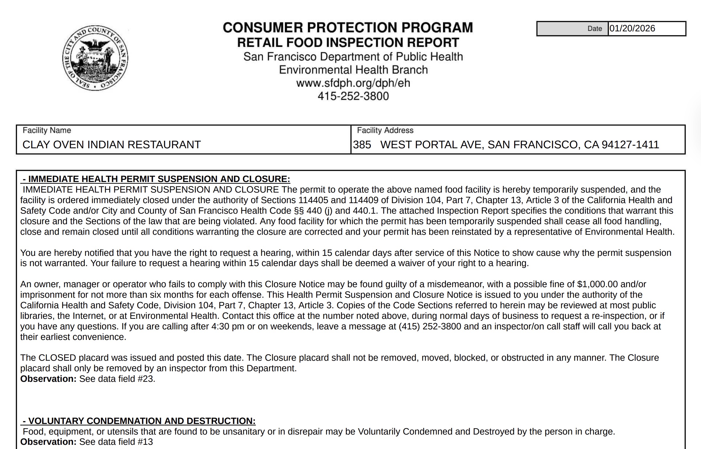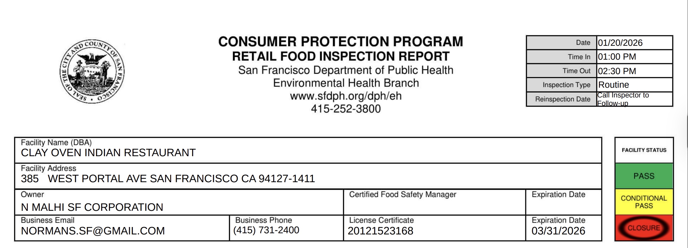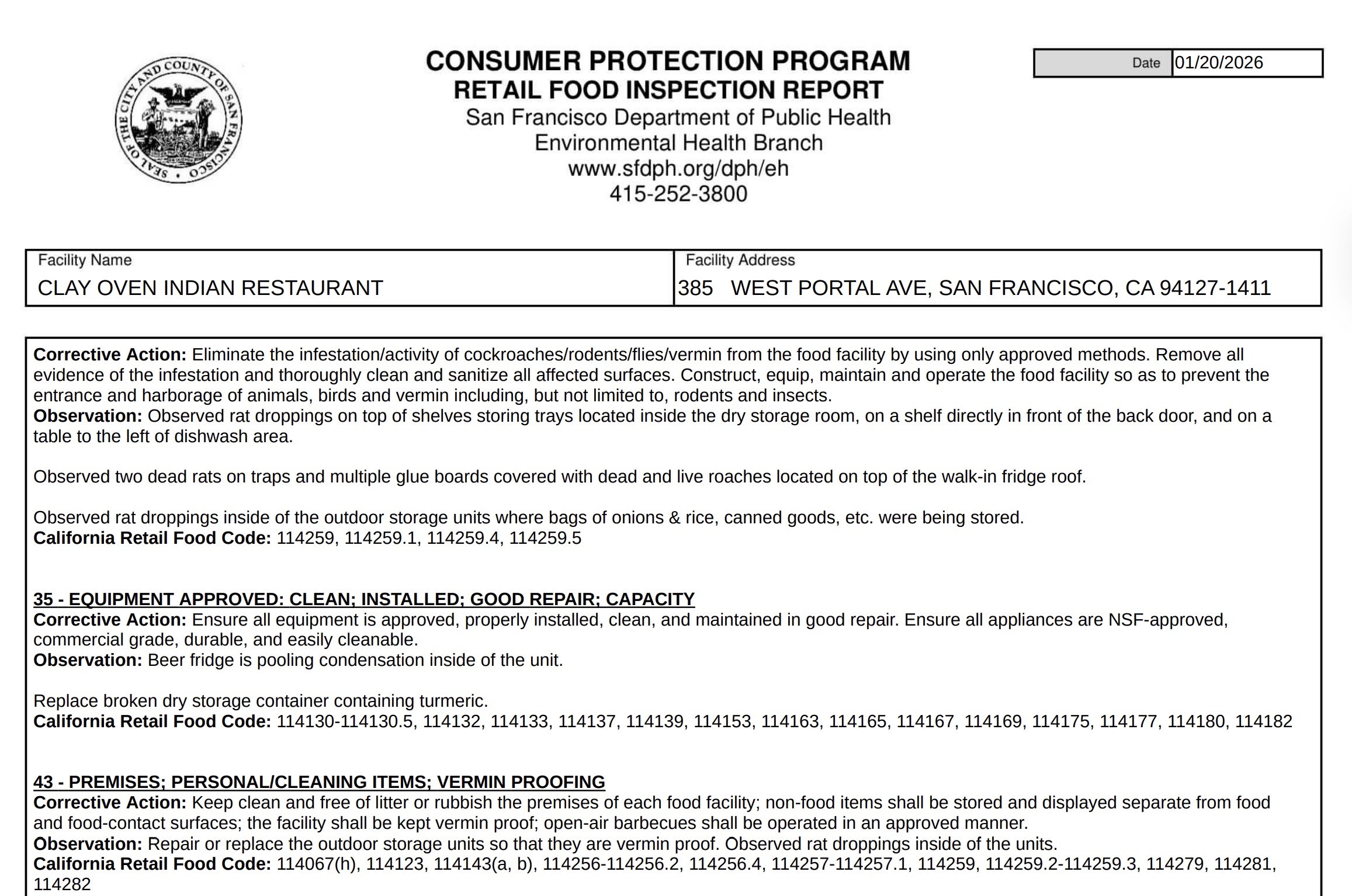 The San Francisco health department carried out a health inspection at Clay Over Indian Restaurant on January 20. The restaurant was cited for multiple health code violations during the inspection, resulting in a closure.