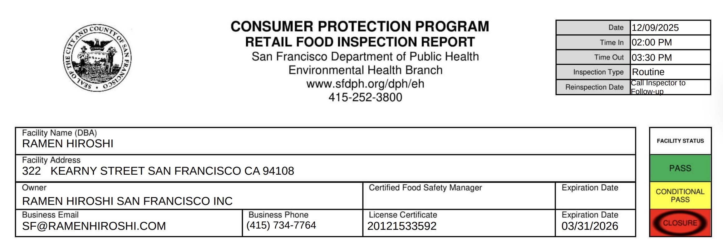 The San Francisco health department conducted several health inspections on December 9 in the area. Among them, Ramen Hiroshi was cited for several violations, including improper holding temperatures, mold, and grease accumulation.