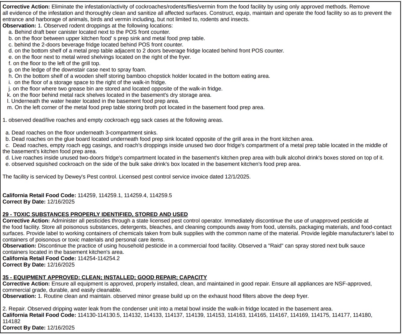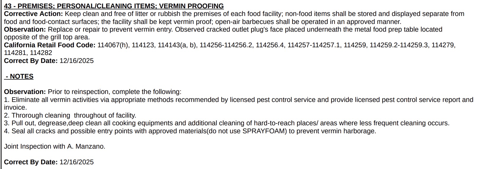 According to the official report, the restaurant is expected to correct all the major violations by December 16, ahead of the reinspection. All pest infestations must be addressed according to the licensed pest control service’s guidance. The eatery is also expected to deep-clean the facility, including all cooking equipment and hard-to-reach places.