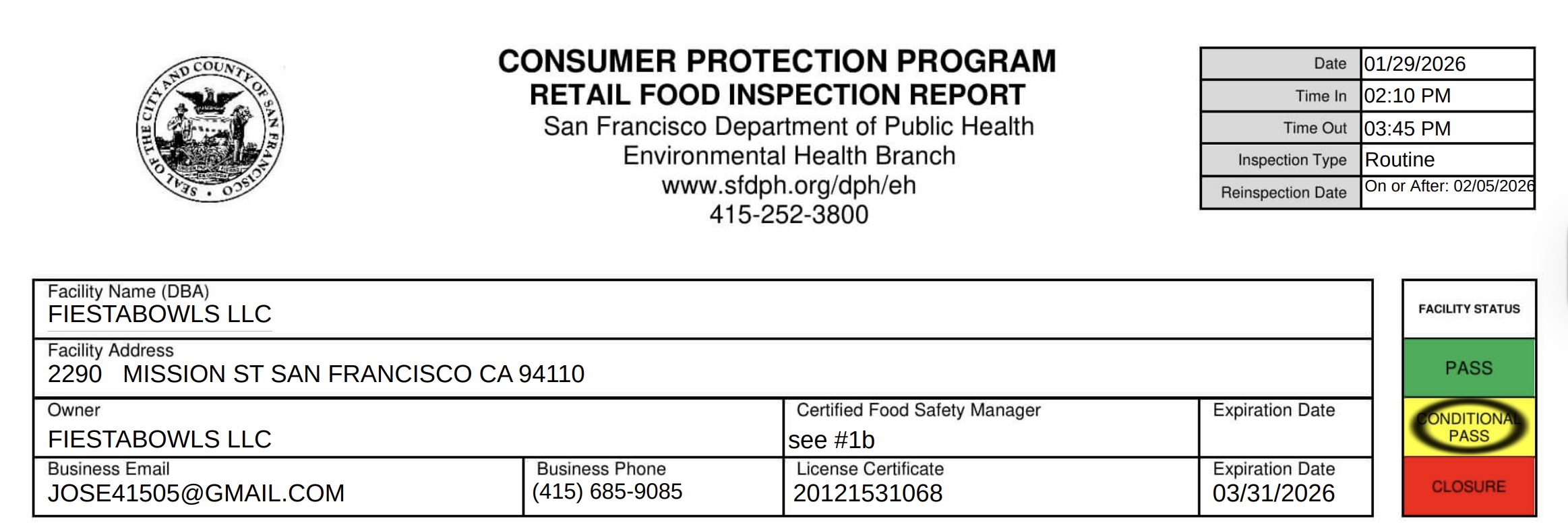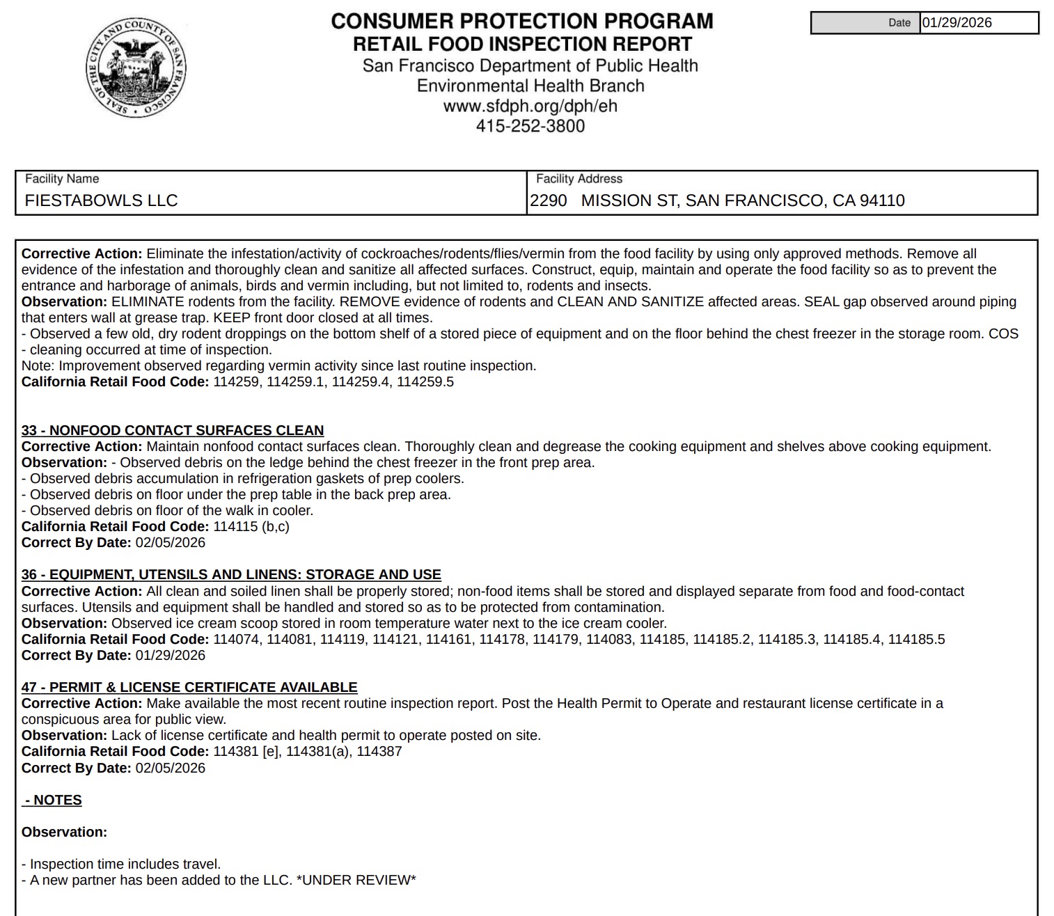 The San Francisco Department of Public Health conducted a health inspection at Fiestabowls LLC on January 29. The inspection report cited multiple health code violations, requiring correction prior to reinspection.