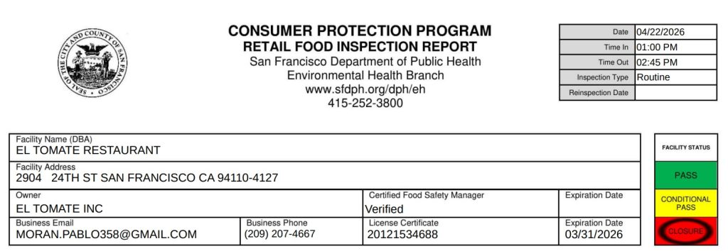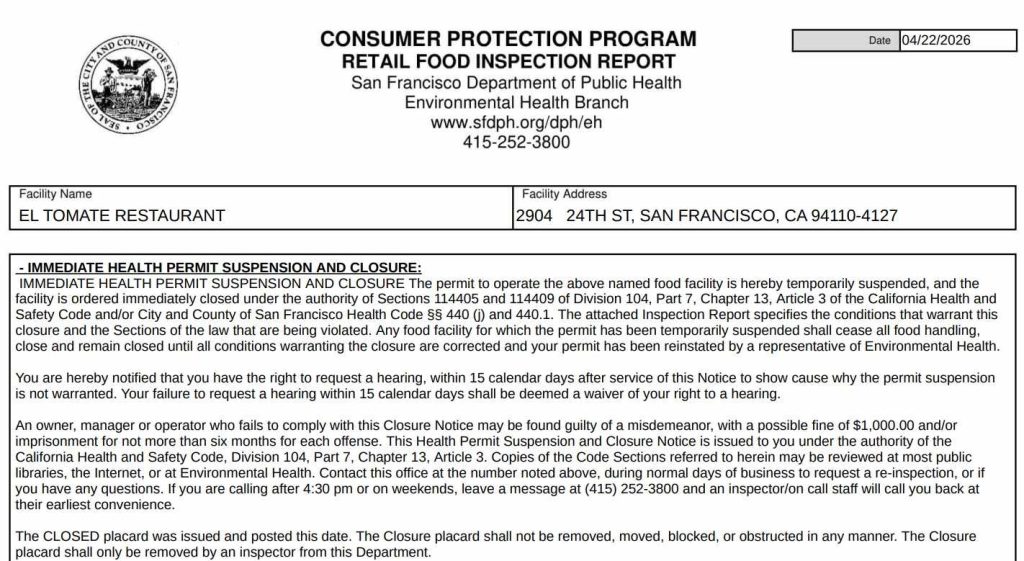 On April 22, the department suspended El Tomate Restaurant’s health permit and ordered the restaurant to close.