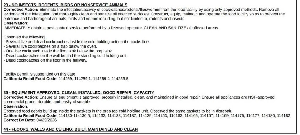- The inspection report noted several live and dead cockroaches on the cook’s line and inside the cold holding unit.