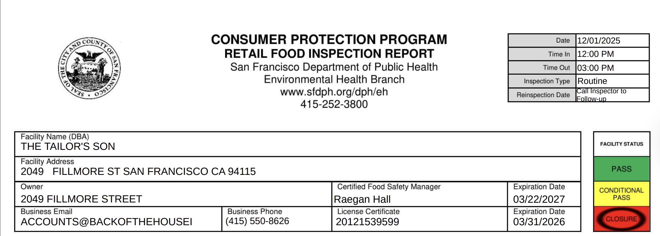 The San Francisco health department conducted a routine inspection on December 1 at The Tailor’s Son. The report revealed that the restaurant had reported multiple food safety code violations, some of which included rodent infestation and improper holding temperatures.