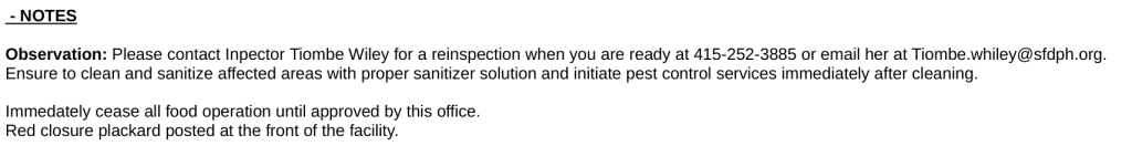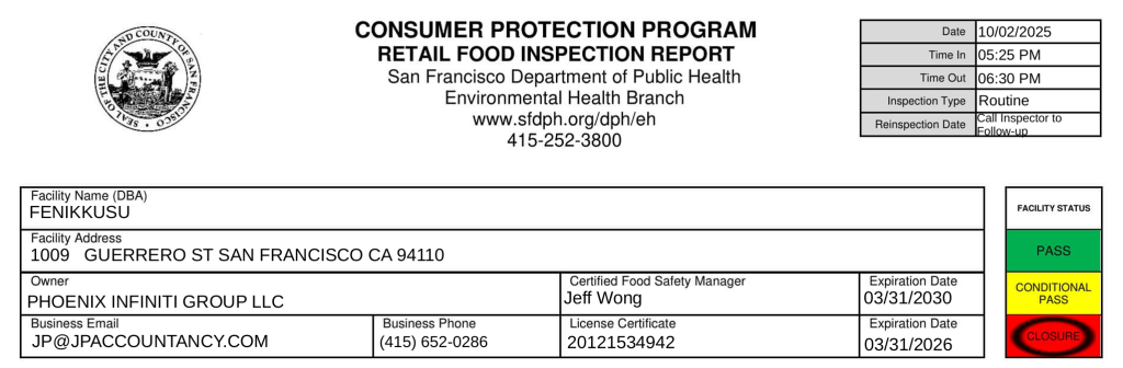 The report recommended that Fenikkusu request a reinspection when ready. Additionally, the San Francisco-based eatery was asked to clean and sanitize the affected areas.