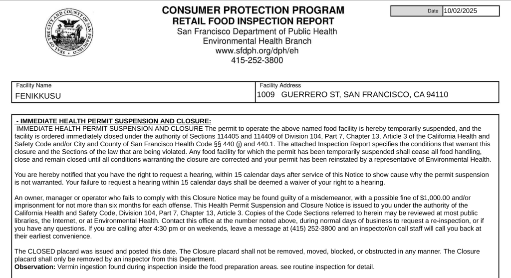 On October 2, the San Francisco Department of Public Health conducted a routine inspection of Fenikkusu. The casual Japanese facility was asked to close temporarily due to health code violations.