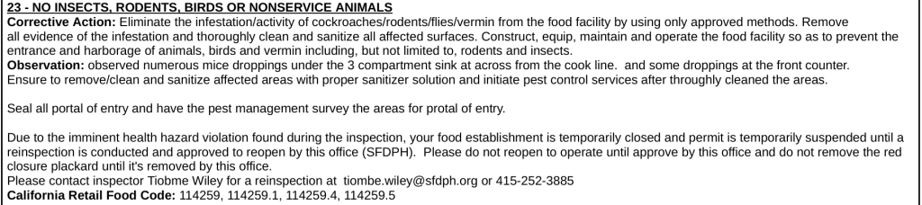 The report added that mice droppings were seen by the inspectors at Fenikkusu’s food preparation areas. These included the area under its 3-compartment sink near the cook line and at the front counter.