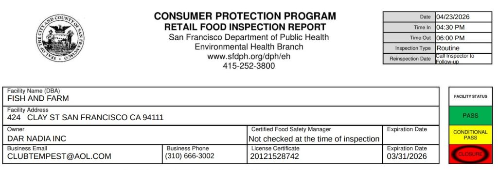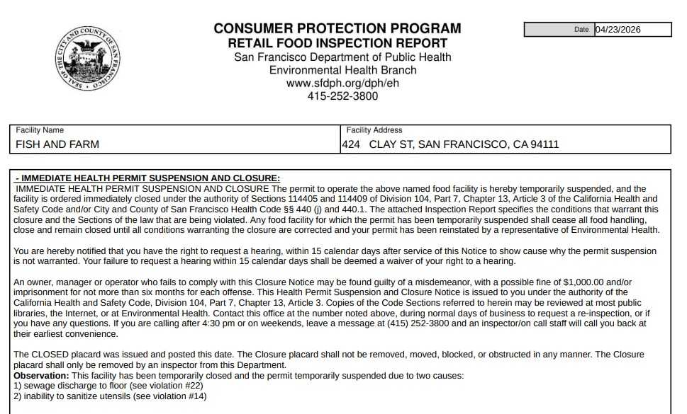 The San Francisco Department of Public Health conducted a routine health inspection at Fish and Farm on April 23. Following the health inspection, the restaurant was ordered to close after inspectors documented multiple violations.