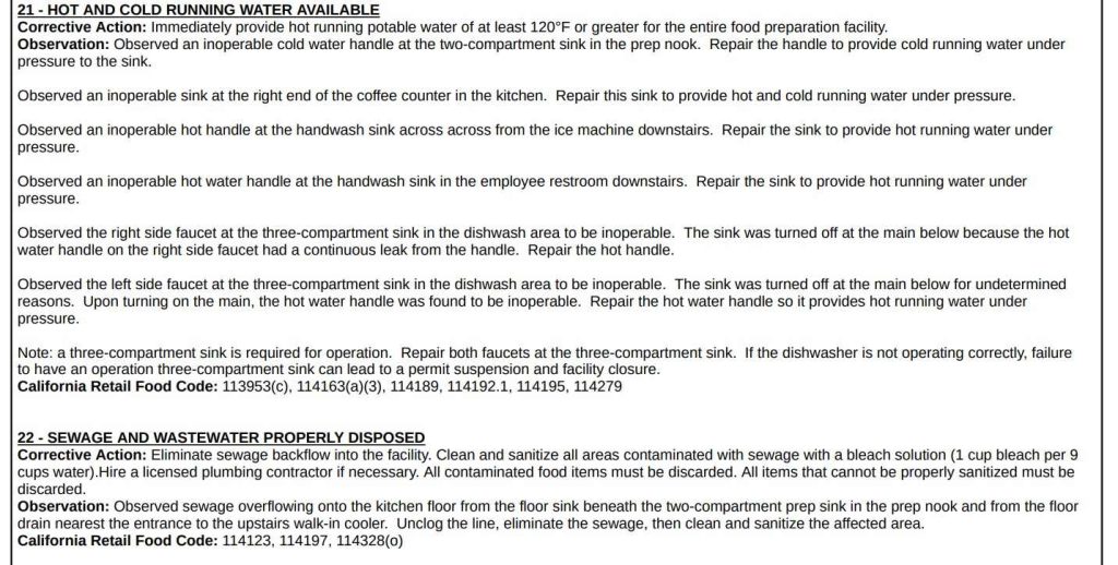- The inspection report also mentions that the right-side faucet at the three-compartment sink in the dishwashing area was broken. The facility had turned off the main tap below the sink, as the hot water handle on the right-side faucet was leaking continuously.