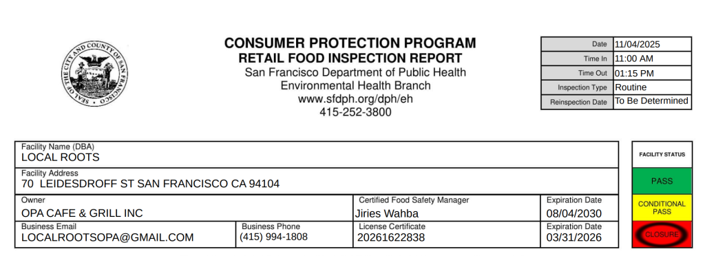 A routine inspection by the San Francisco Department of Public Health, which also involved a foodborne illness investigation, led to the temporary closure of Local Roots. The restaurant will undergo a reinspection after which it will be able to reopen for business.