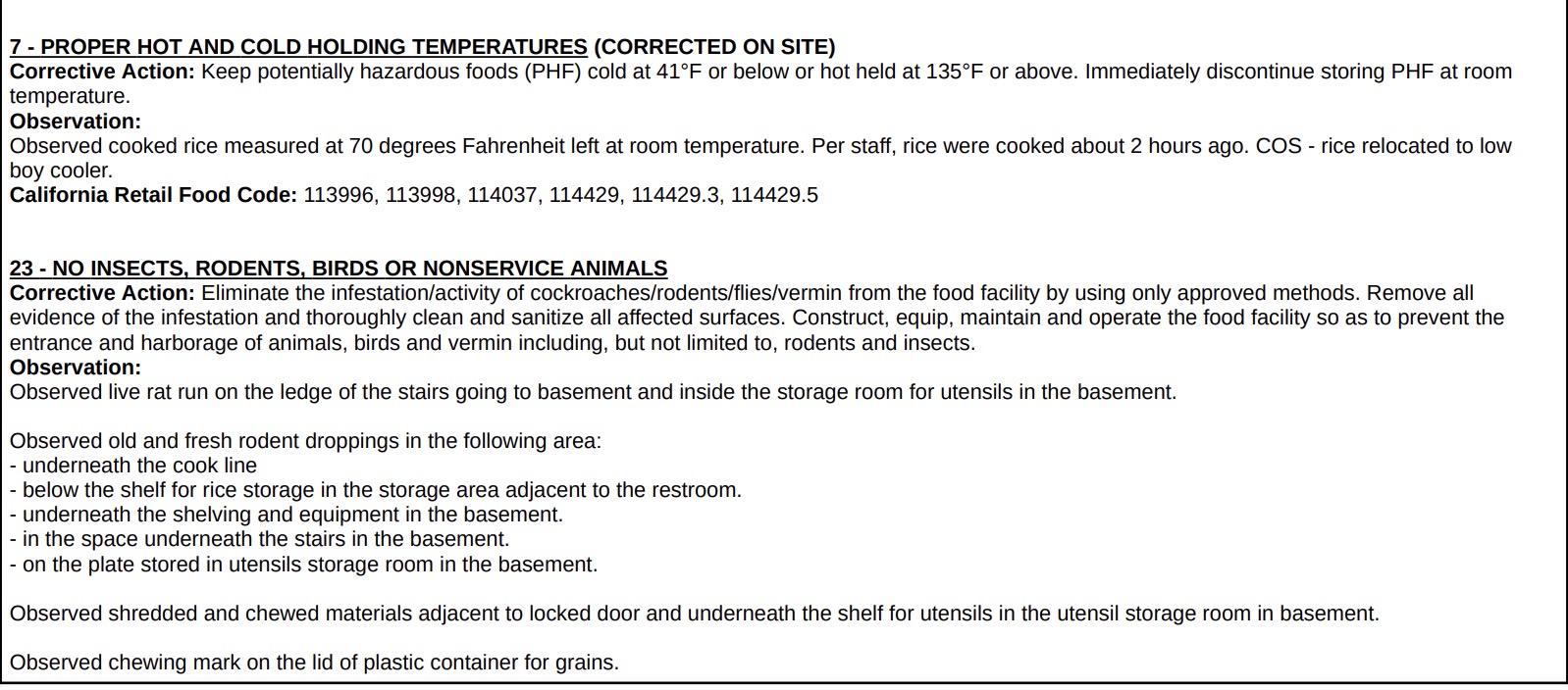 - The inspection report described live rodent activity, including a rat seen along a stair ledge and inside the basement utensil storage room. Old and fresh rodent droppings were found in multiple areas, including underneath the cook line, beneath rice storage shelving near the restroom, under shelving and equipment in the basement, beneath the basement stairs, and on a plate stored in the utensil storage room.