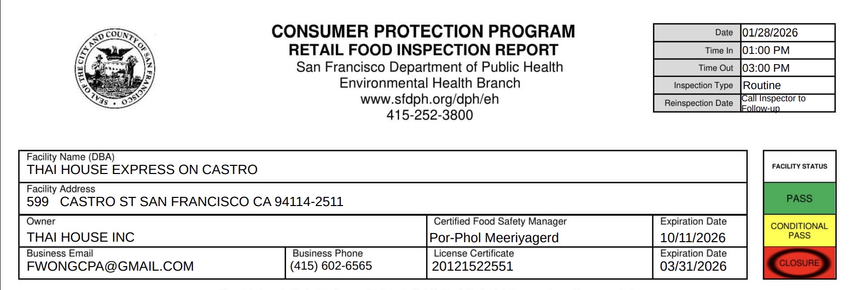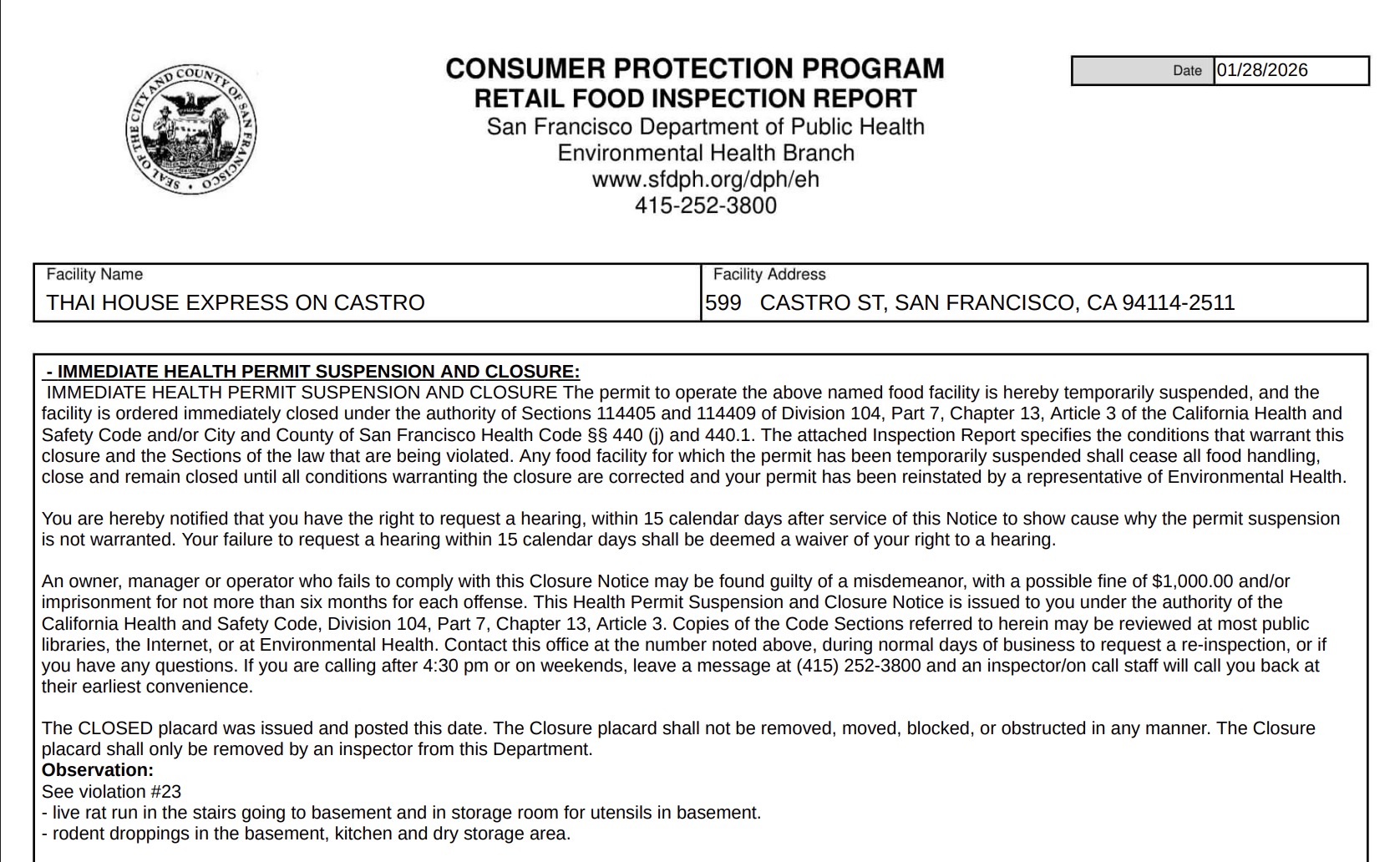 During a January 28 inspection, the San Francisco health department cited Thai House Express on Castro Street for multiple health code violations. The report cited evidence of rodent activity, and the restaurant received a temporary closure.