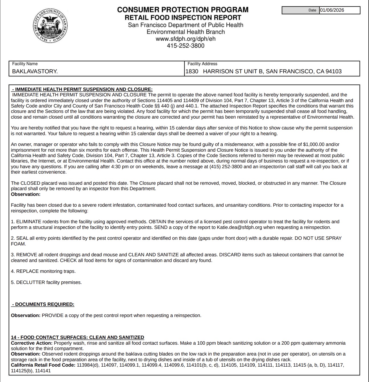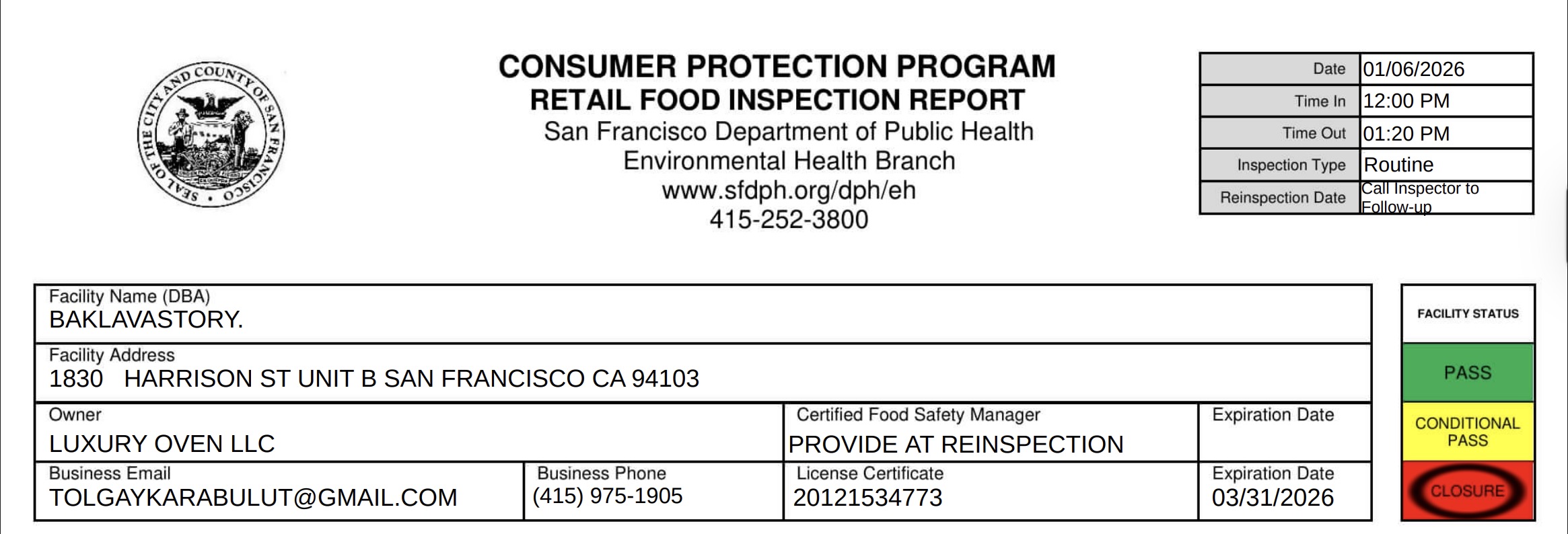The San Francisco Department of Public Health conducted routine health inspections on January 6. Turkish Bakery BaklavaStory was cited for multiple major health code violations and received a red placard, according to the inspection report.