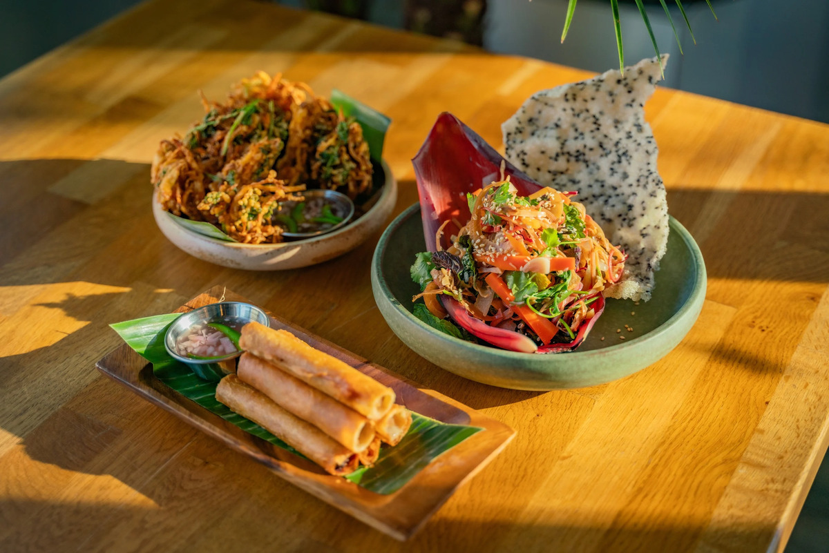 Menu offerings reflect the diverse backgrounds of the worker collective, with influences from Thai, Mexican, Filipino, Vietnamese, Salvadoran, and Turkish cuisines. Breakfast burritos, rice bowls, and sandwiches are available during the day, while brunch includes items such as Ube Waffles and Vegan Longganisa. Dinner service features shared plates like Pork Lumpia, Soy Calamansi Skewers, Tofu Larb, and Pamapa Itum Wings.