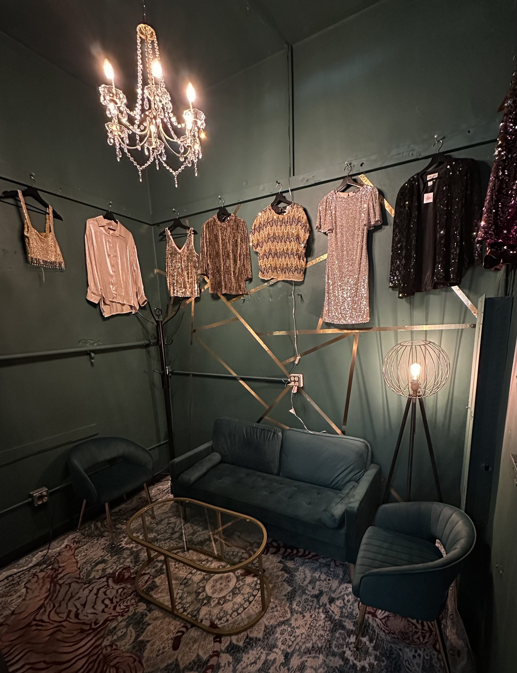She continued, “I cleared everything out of the room and moved it into this tiny corner. When you walk into the speakeasy, there will be an art wall to start showcasing local artists. I just got some gallery lights to put up. I hung up my sequined-type New Year’s Eve outfits and costume pieces. I got a velvet green couch in there with a coffee table.”