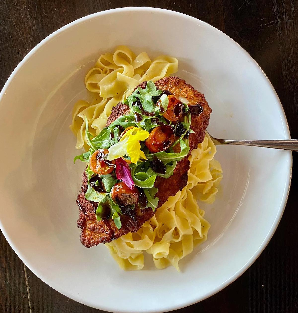 Pasta entrees—to which can be added proteins like chicken, shrimp, sausage, and homemade meatballs—include Penne alla Vodka, Tagliatelle Bolognese, and classic homemade Spaghetti. For dessert: Italian classics like Cannoli by Vito Bavaro, Tiramisu, and Gelato.
