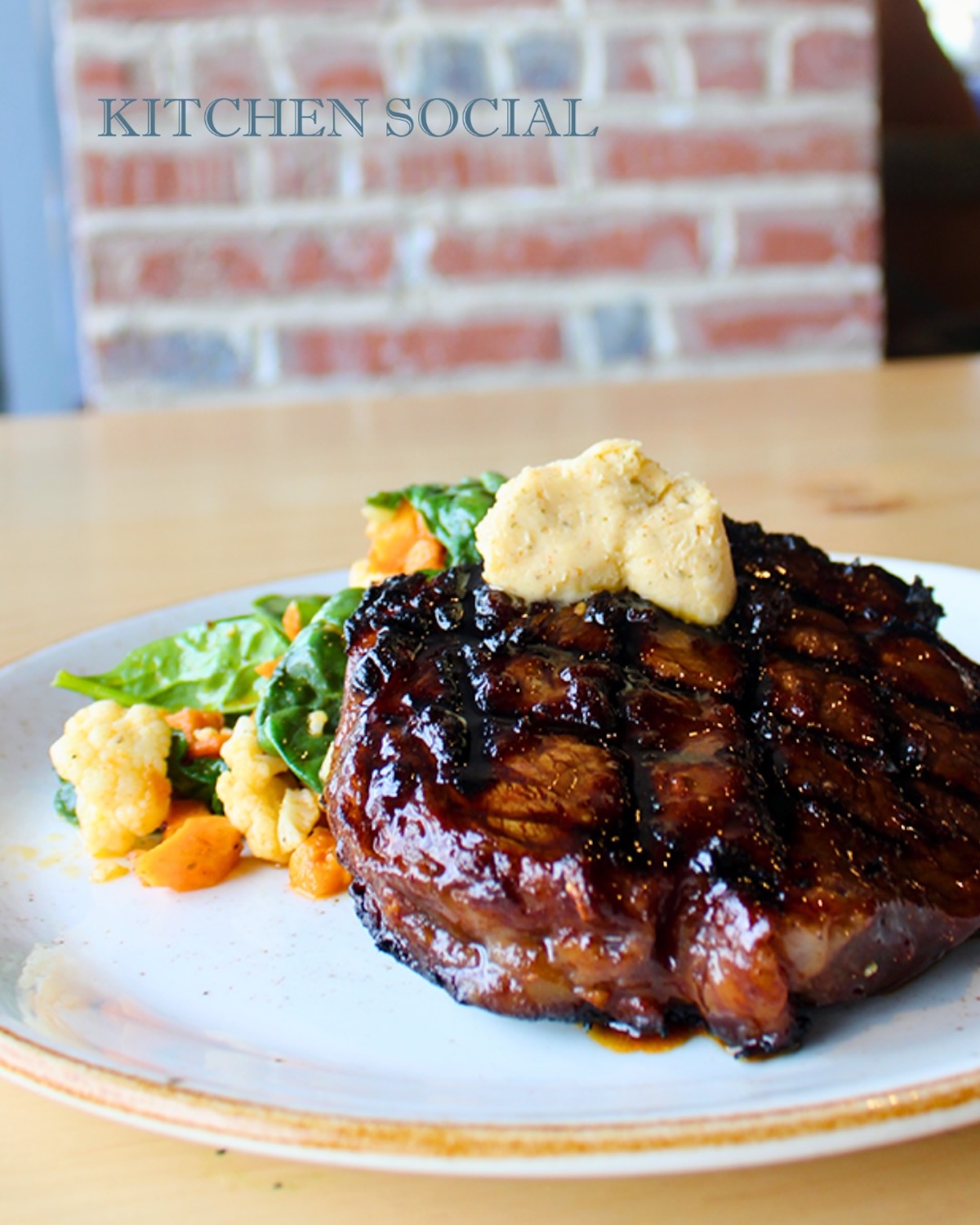 Kitchen Social’s menus have featured signature starters like Cheddar & Scallion Biscuits, Whipped Feta (Sweet + spicy peppers, honey, toasted ciabatta, black pepper), and Crispy Thai Shrimp (Radish, carrots, scallions, napa cabbage, cilantro vinaigrette). The eclectic selection of entrees include ranges from Blackened Shrimp Capellini and Fish & Chips to Chicken Katsu and Teriyaki Ribeye.
