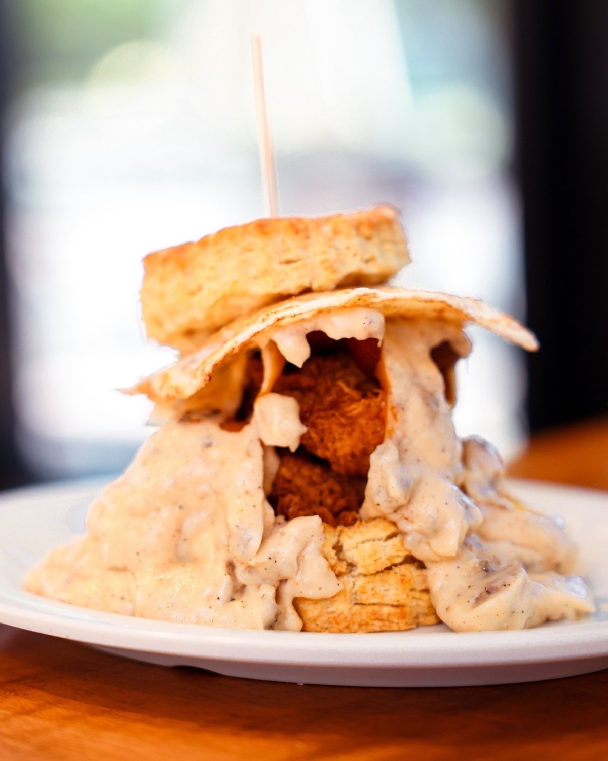 Maple Street’s Biscuit Sandwiches come in varieties like the Five & Dime (Fried Chicken, Bacon, Cheddar, Egg, Sausage or Shiitake Gravy with a kick), The Sticky Maple (Bissell Family Farms Classic Syrup, Fried Chicken, Bacon), and The Cowboy (Country Fried Steak, Bacon, Cheddar, Egg, Sausage or Shiitake Gravy with a kick).