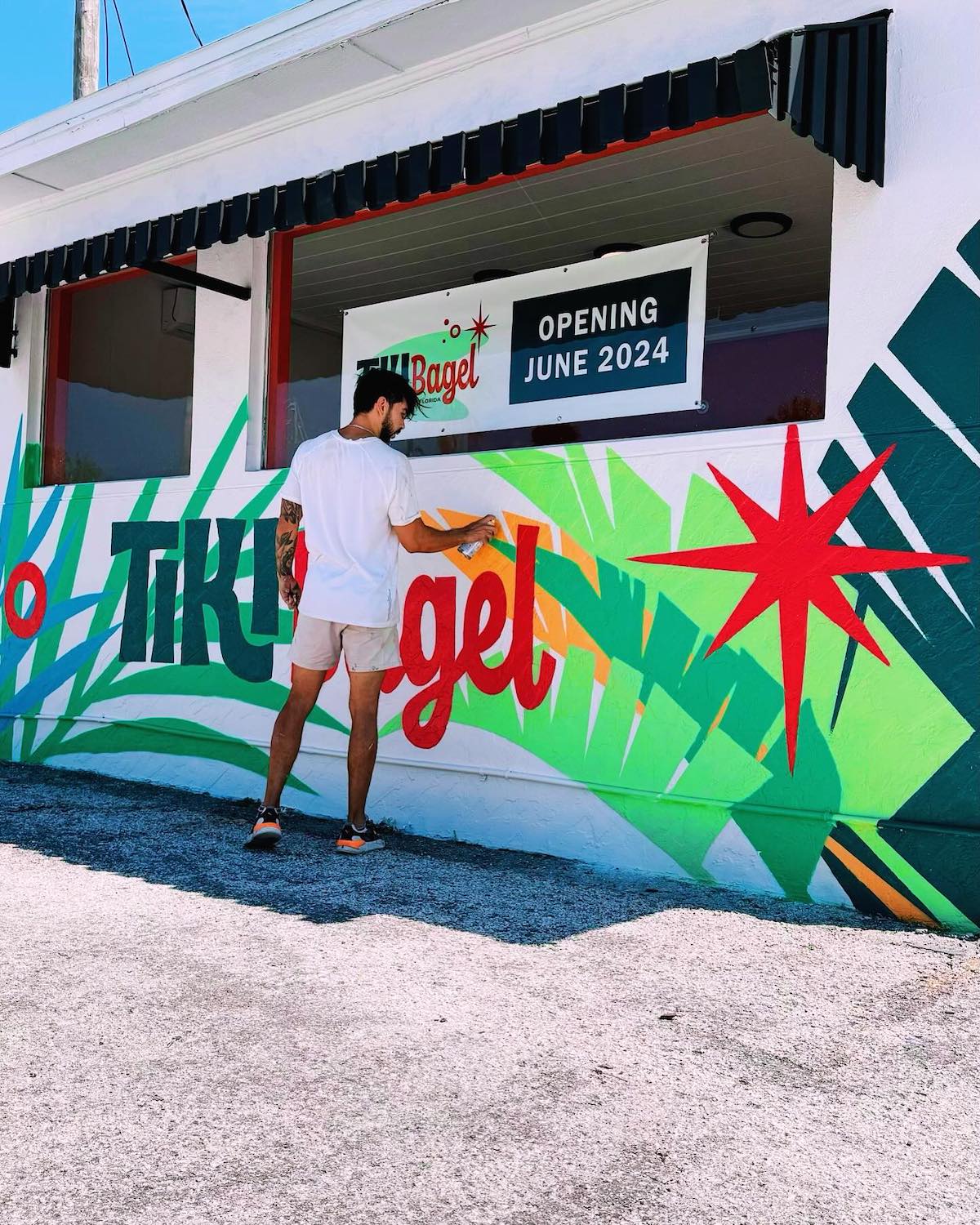 Launching in a convenient location, the Tiki Bagel space will feature seating for just over 50 guests in the former home of Gayle’s Diner, including both indoor and outdoor seating. Local artist Leo Gomez is also putting together a mural on the side of the building.