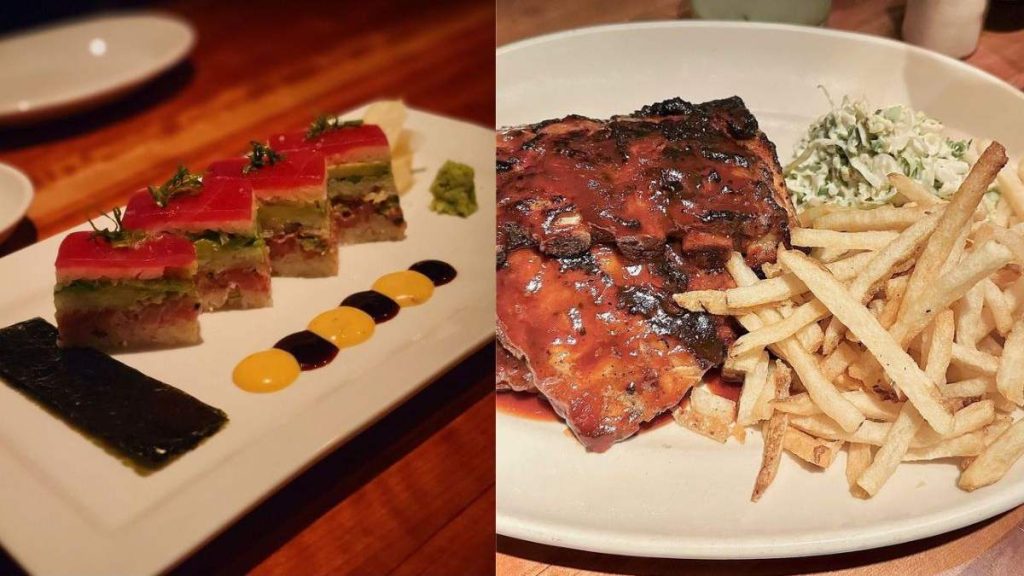Some menu highlight items include house-made veggie burgers, Thai Noodle Salad, Hiramasa Roll, Rotisserie Chicken, Spicy Tuna Roll, and more delicacies. French Martini, Le Boulevardier, and Jackrabbit are a few drinks that were served at Woodmont Grill.